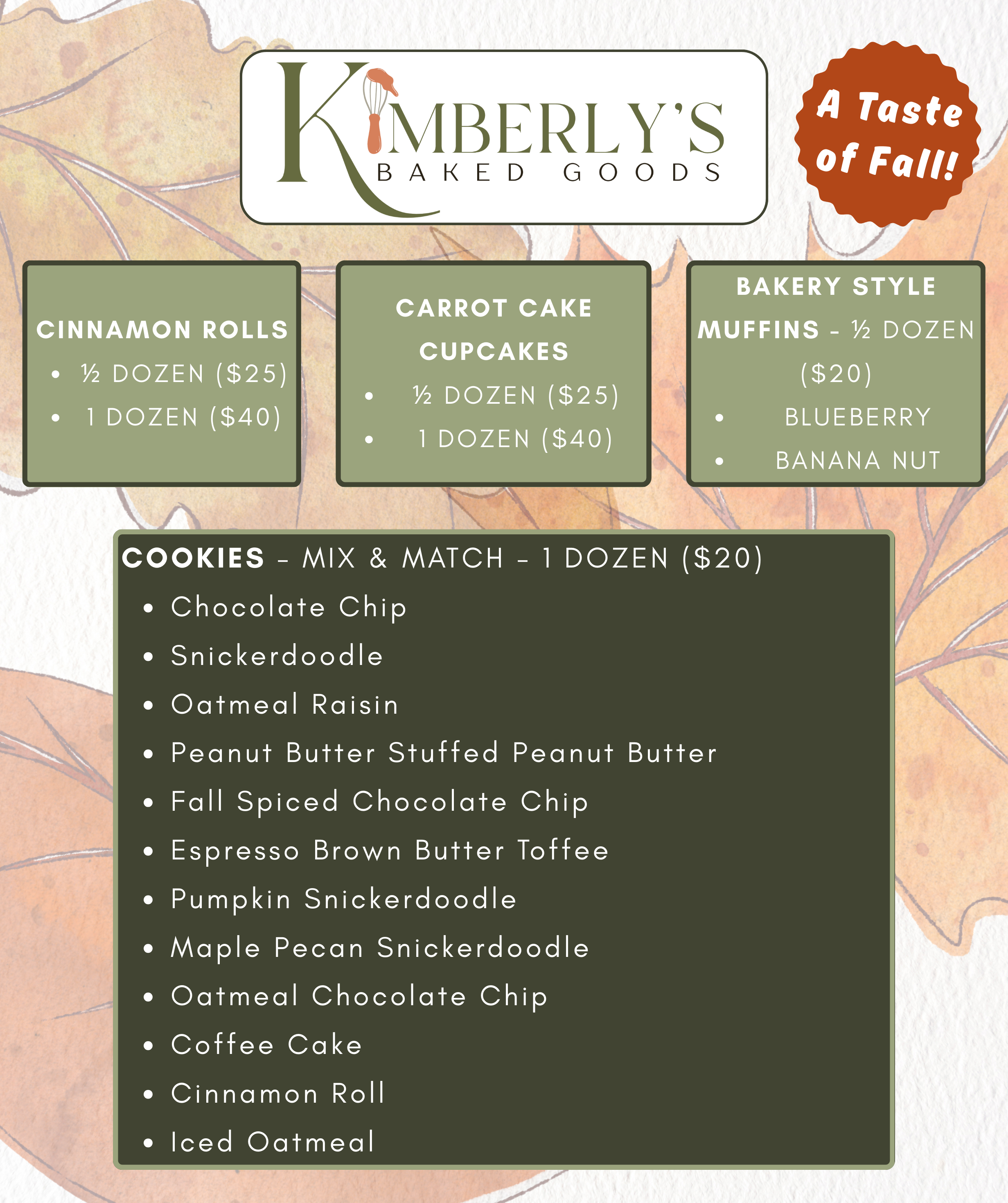 ORDERS MUST BE PLACED AT LEAST 48 HOURS PRIOR TO PICK-UP DATE Order Cinnamon Rolls Here! Name: * First Name Last Name Email: * How Many? * 1/2 Dozen ($25) 1 Dozen ($40) Pick-Up Date * MM DD YYYY How did you hear about us? Instagram Facebook Found Us Online Through a Friend Thank You For Your Order!You will receive a confirmationemail within 24 hours! Order Carrot Cake Cupcakes Here! Name: * First Name Last Name Email: * How Many? 1/2 Dozen ($25) 1 Dozen ($40) Pick-Up Date * MM DD YYYY How did you hear about us? Instagram Facebook Found Us Online Through a Friend Thank You For Your Order!You will receive a confirmationemail within 24 hours! Order Muffins Here! Name: * First Name Last Name Email: * What Flavor? * 1 Dozen Blueberry ($25) 1 Dozen Banana Nut ($25) Pick-Up Date * MM DD YYYY How did you hear about us? Instagram Facebook Found Us Online Through a Friend Thank You For Your Order!You will receive a confirmationemail within 24 hours! Order Cookies Here! Name: * First Name Last Name Email: * How Many Dozen? * Cookie Order Details: * How Many of Each Cookie? Pick-Up Date * MM DD YYYY How did you hear about us? Instagram Facebook Found Us Online Through a Friend Thank You For Your Order!You will receive a confirmationemail within 24 hours!